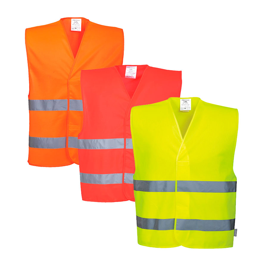 Colete de alta visibilidade amarelo flurescente ou laranja flurescente.
